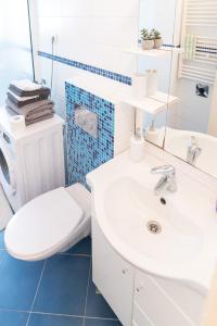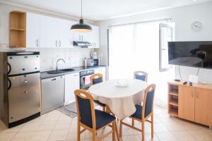 W pełni wyposażony aneks kuchenny obejmuje kuchenkę ze strefą pieczenia i mikrofalówką oraz zmywarkę, lodówkę, toster, czajnik elektryczny, zestaw do parzenia kawy i herbaty, stół jadalny oraz naczynia umożliwiające wygodne przygotowywanie posiłków podczas pobytu. Do dyspozycji gości pozostaje telewizor z płaskim ekranem oferujący kanały kablowe oraz odtwarzacz DVD. Dodatkowym udogodnieniem jest bezpłatny parking na terenie posesji znajdujący się przy mieszkaniu na parterze.