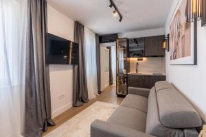 Ta jednopokojowa kawalerka posiada salon z rozkładaną sofą oraz telewizor z płaskim ekranem i usługami streamingowymi takimi jak Netflix. W pełni wyposażony aneks kuchenny zawiera mikrofalówkę, lodówkę, minibar, płytę grzewczą, czajnik elektryczny oraz zestaw do parzenia herbaty i kawy wraz ze sprzętem kuchennym umożliwiającym wygodne przygotowywanie posiłków.
